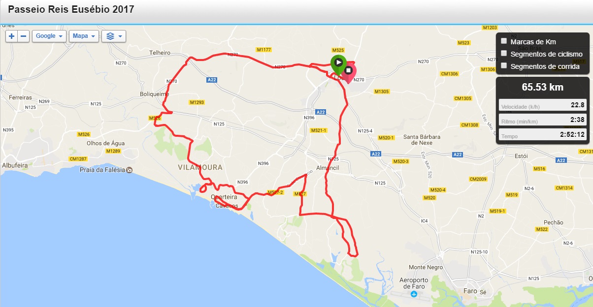 Concentração e confirmação das inscrições a partir das 08h00 em Loulé na Praça da Republica (frente a Camara Municipal de Loulé) com fecho do secretariado as 08h45. O passeio, com cerca de 65km com dificuldade média, será iniciado as 09h00 na Praça da Republica, passando pelas freguesias de Almancil, Quarteira e Boliqueime, com final na pista Bexiga Peres em Loulé. Teremos uma paragem em Quarteira, no local onde Joaquim Agostinho sofreu a fatídica queda, originando o seu falecimento, para prestar homenagem ao maior ciclista Português até a data. O almoço convívio, entregas de prémios as equipas e vencedores do prémio montanha, será nas instalações do Grupo Desportiva Barreiras Brancas, a partir das 13H00.